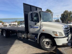 2013 Hino 268A Flatbed Stock #24326. This pre-owned truck has approximately 321,000 miles, an Allison 2500 RDS (PTO) transmission, air suspension, a 24 ft. flatbed, and a 25,950 lb. GVWR. It features a 253" wheelbase, 185.6" cab-to-axle, and a single 90-gallon fuel tank. Price coming soon; contact us for details or to schedule a viewing (805)644-3000.