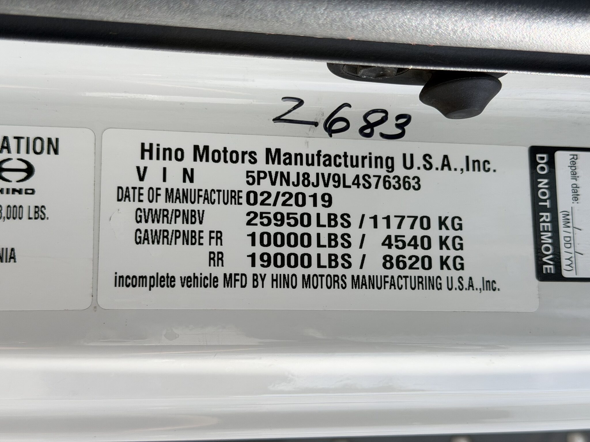 This is a 2020 Hino 268A (Stock #2683), a well-maintained, work-ready mover truck built for performance and durability. Powered by a reliable J08-E VB 8-liter, 4-cycle, 6-cylinder in-line water-cooled diesel engine delivering 260 horsepower, and paired with an Allison 2200 RDS automatic transmission with PTO provision, this truck offers the strength and smooth operation professionals demand. It features air suspension for a comfortable ride, air brakes for dependable stopping power, and a 271" wheelbase with a 203.6" cab-to-axle measurement. With a GVWR of 25,950 lbs., a 10,000 lb. front axle rating, and a 19,000 lb. rear axle rating, this truck is built to handle serious payloads. The 90-gallon single fuel tank keeps you on the road longer.