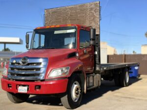 2014 Hino 268A Flatbed Stock #249909. This pre-owned truck has approximately 289,000 miles, an Allison 2200 RDS (PTO) transmission, air suspension, a 24 ft. flatbed, and a 25,950 lb. GVWR. It features a 235" wheelbase, 167.6" cab-to-axle, and a single 95-gallon fuel tank. Contact us for details or to schedule a viewing (805)644-3000.
